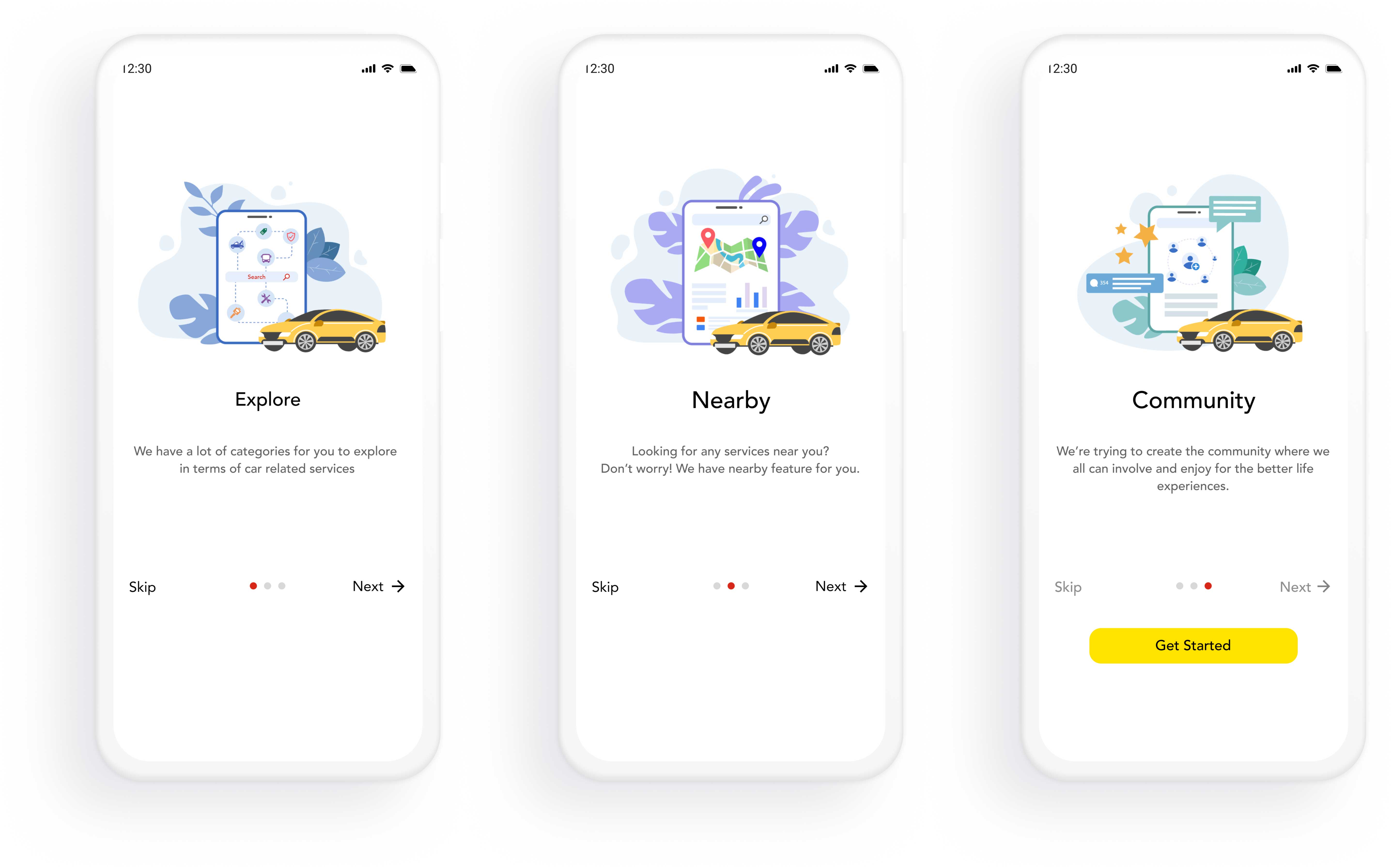 Onboarding illustrations represent the core features and provide a glimpse into the overall feel of the app.
